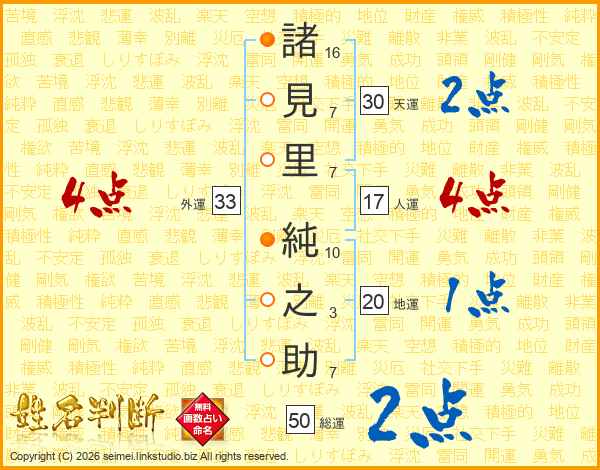 諸(16画)見(7画)里(7画) 純(10画)之(3画)助(7画)