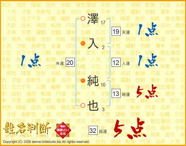 あなたの人生を表す1番重要な運勢です。生涯を通じて影響する総合運となり、主に50歳以降の晩年期に影響を及ぼします。苗字と名前の合計画数。