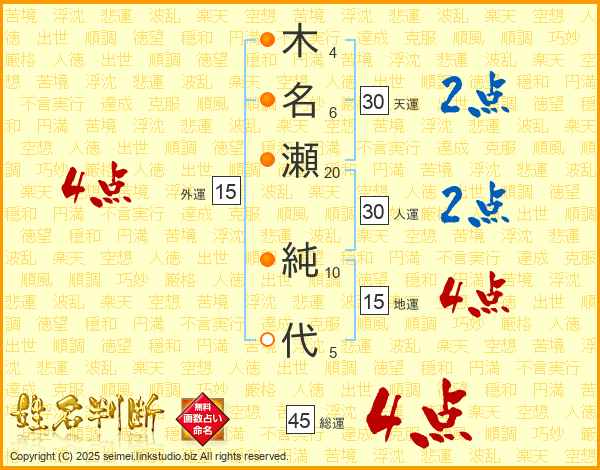 木(4画)名(6画)瀬(20画) 純(10画)代(5画)