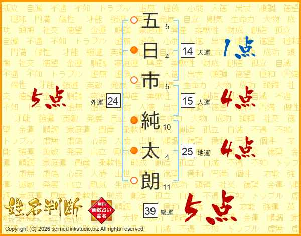 五(5画)日(4画)市(5画) 純(10画)太(4画)朗(11画)