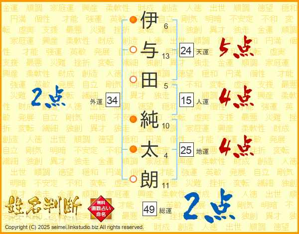 伊(6画)与(13画)田(5画) 純(10画)太(4画)朗(11画)
