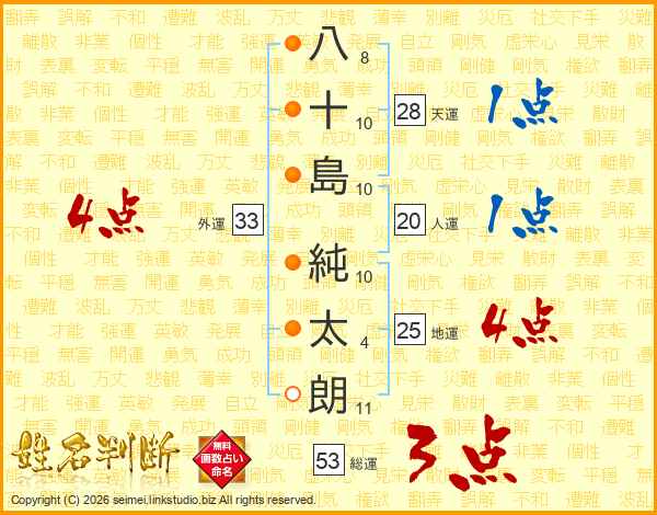 八(8画)十(10画)島(10画) 純(10画)太(4画)朗(11画)