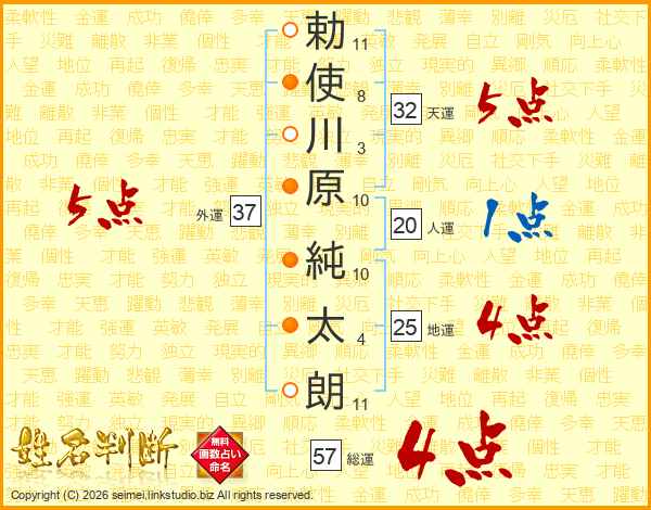勅(11画)使(8画)川(3画)原(10画) 純(10画)太(4画)朗(11画)