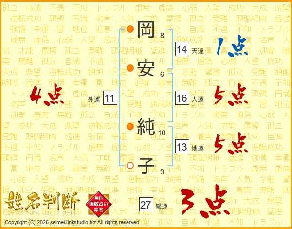 岡(8画)安(6画) 純(10画)子(3画)