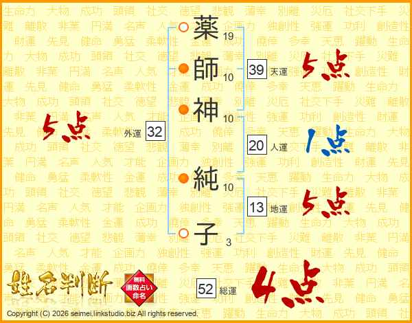 薬(19画)師(10画)神(10画) 純(10画)子(3画)