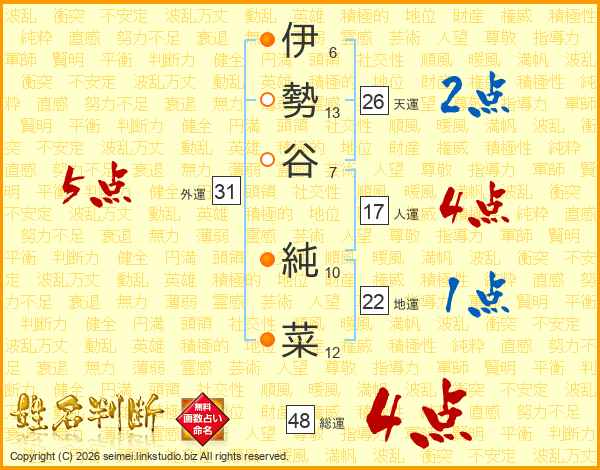 伊(6画)勢(13画)谷(7画) 純(10画)菜(12画)