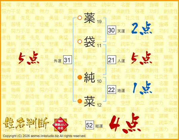 生活面を象徴する運勢です。外部から受ける影響力を表し、結婚運、家庭運や職場、環境への順応性を表します。総運から人運を引いた画数。姓や名が1文字の場合を除く。
