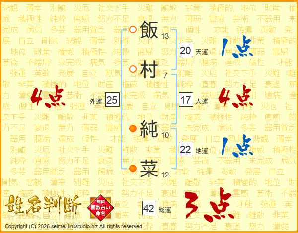 飯(13画)村(7画) 純(10画)菜(12画)