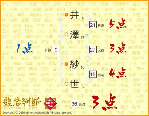 井(4画)澤(17画) 紗(10画)世(5画)