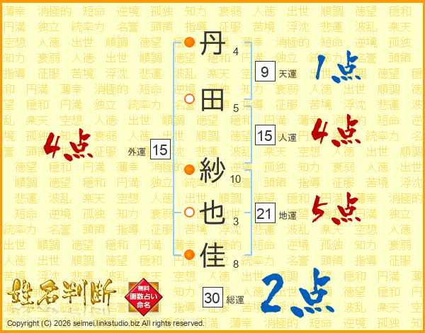 丹(4画)田(5画) 紗(10画)也(3画)佳(8画)