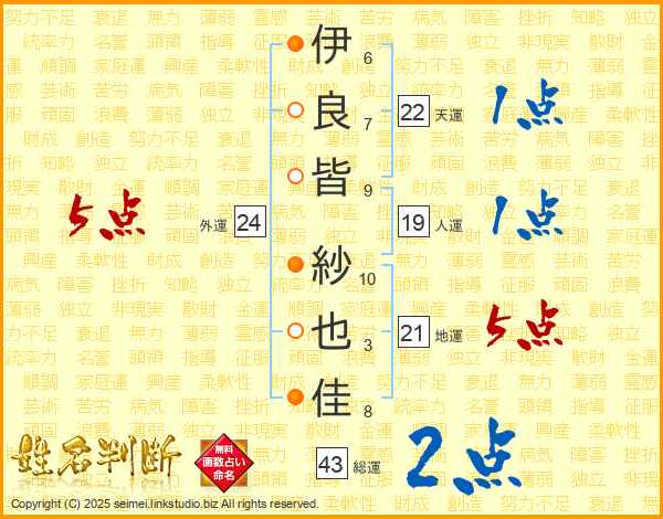 伊(6画)良(7画)皆(9画) 紗(10画)也(3画)佳(8画)