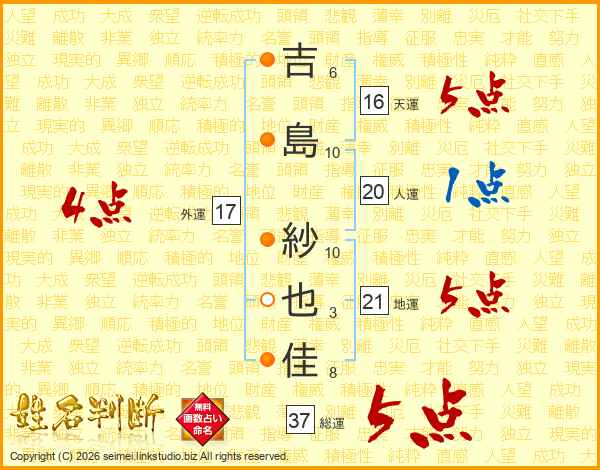 吉(6画)島(10画) 紗(10画)也(3画)佳(8画)