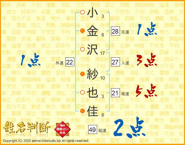 小(3画)金(8画)沢(17画) 紗(10画)也(3画)佳(8画)