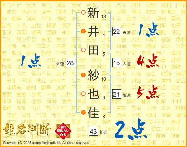 新(13画)井(4画)田(5画) 紗(10画)也(3画)佳(8画)