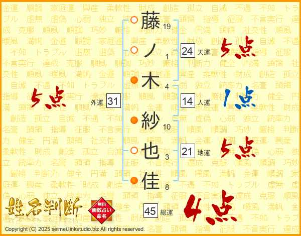 藤(19画)ノ(1画)木(4画) 紗(10画)也(3画)佳(8画)
