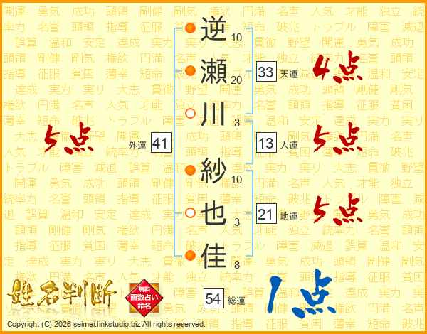 逆瀬川紗也佳さんの外運は41画の5点!