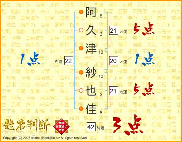 阿(8画)久(3画)津(10画) 紗(10画)也(3画)佳(8画)