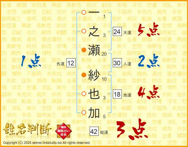 一(1画)之(3画)瀬(20画) 紗(10画)也(3画)加(5画)