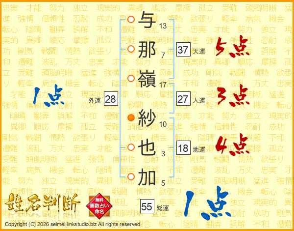 与(13画)那(7画)嶺(17画) 紗(10画)也(3画)加(5画)