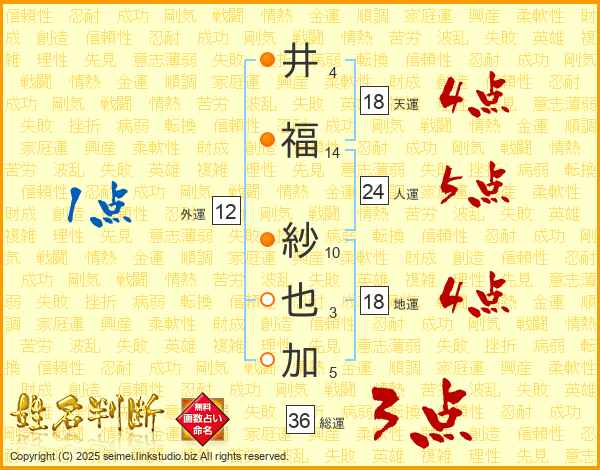 井(4画)福(14画)  紗(10画)也(3画)加(5画)