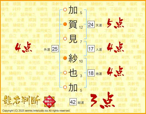加(5画)賀(12画)見(7画) 紗(10画)也(3画)加(5画)