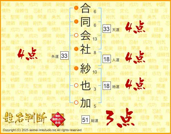 合(6画)同(6画)会(13画)社(8画) 紗(10画)也(3画)加(5画)