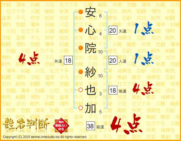 安(6画)心(4画)院(10画) 紗(10画)也(3画)加(5画)
