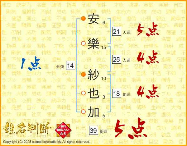 安(6画)樂(15画) 紗(10画)也(3画)加(5画)