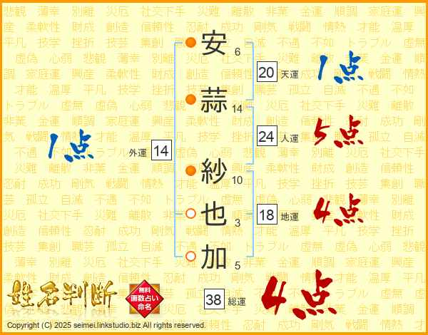 安(6画)蒜(14画) 紗(10画)也(3画)加(5画)