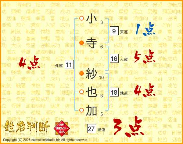 小寺紗也加さんの総運は27画の3点!