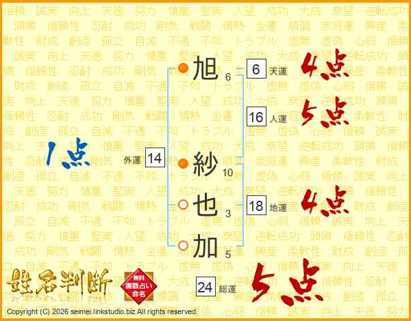 旭(6画) 紗(10画)也(3画)加(5画)