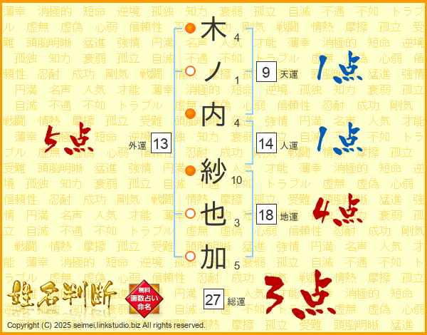 木(4画)ノ(1画)内(4画) 紗(10画)也(3画)加(5画)