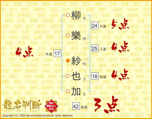 柳(9画)樂(15画) 紗(10画)也(3画)加(5画)