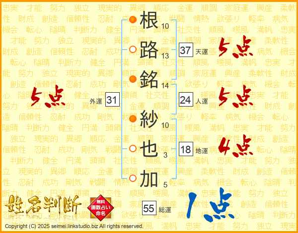 根(10画)路(13画)銘(14画) 紗(10画)也(3画)加(5画)