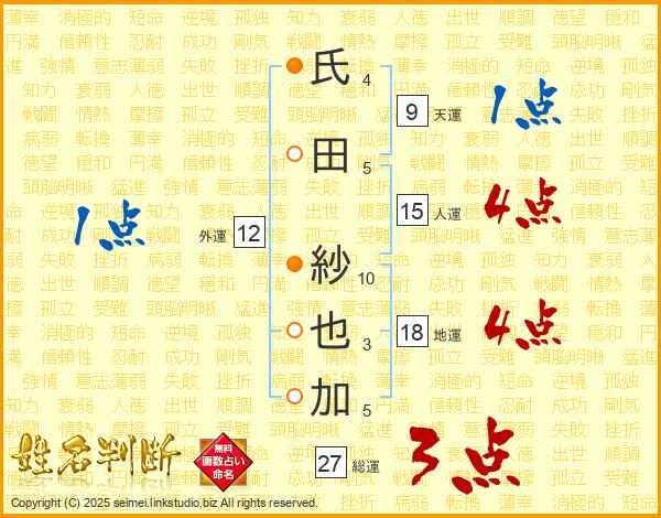 氏(4画)田(5画) 紗(10画)也(3画)加(5画)