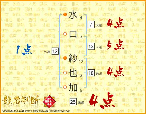 水(4画)口(3画) 紗(10画)也(3画)加(5画)