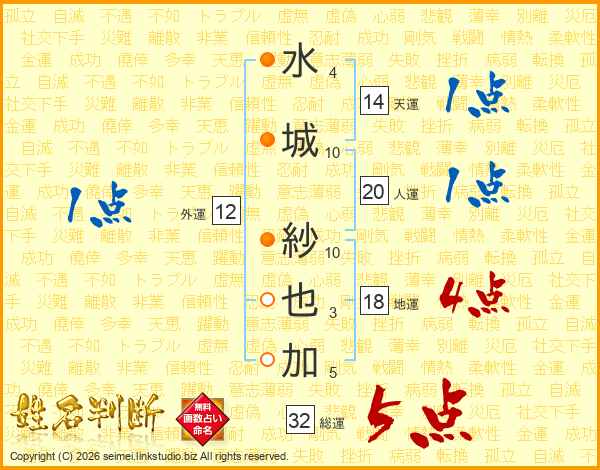 水(4画)城(10画) 紗(10画)也(3画)加(5画)