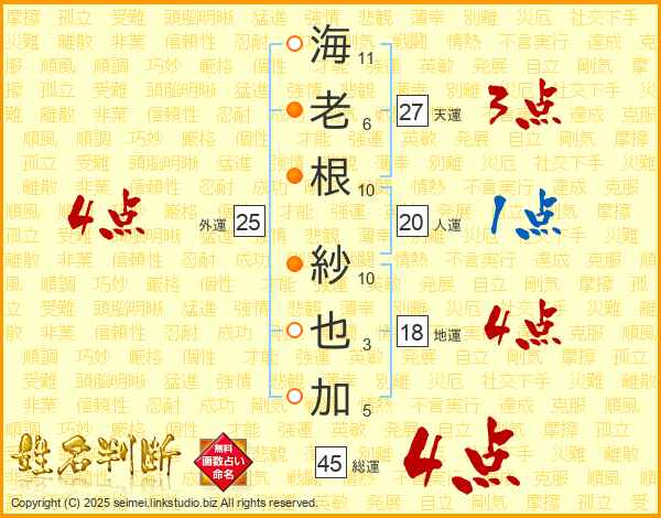 海(11画)老(6画)根(10画)  紗(10画)也(3画)加(5画)