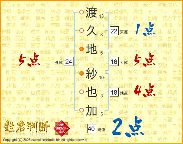 渡(13画)久(3画)地(6画) 紗(10画)也(3画)加(5画)