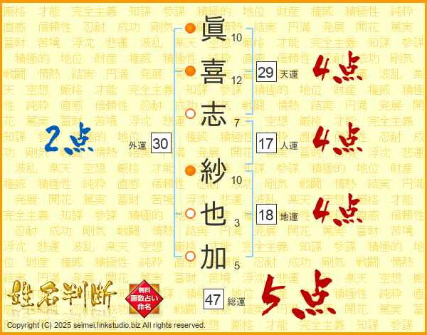 眞(10画)喜(12画)志(7画) 紗(10画)也(3画)加(5画)