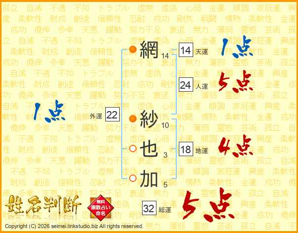 網紗也加さんの天運は14画の1点!