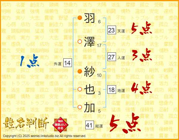 羽(6画)澤(17画) 紗(10画)也(3画)加(5画)