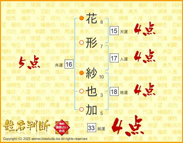 花(8画)形(7画) 紗(10画)也(3画)加(5画)