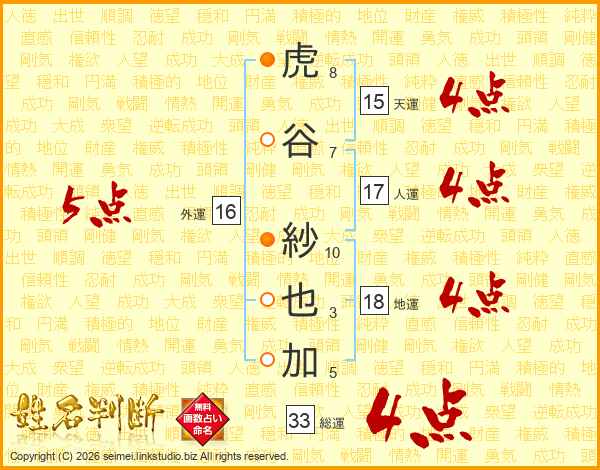 虎谷紗也加さんの総運は33画の4点!