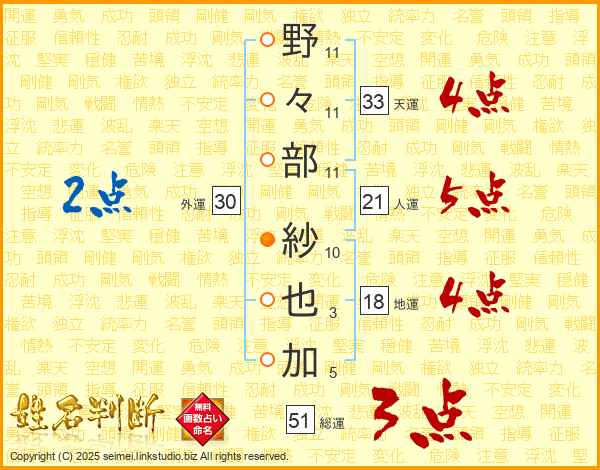 野(11画)々(11画)部(11画) 紗(10画)也(3画)加(5画)