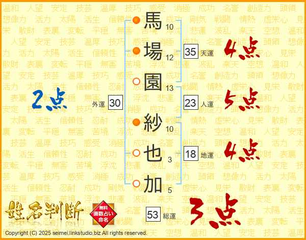 馬(10画)場(12画)園(13画) 紗(10画)也(3画)加(5画)