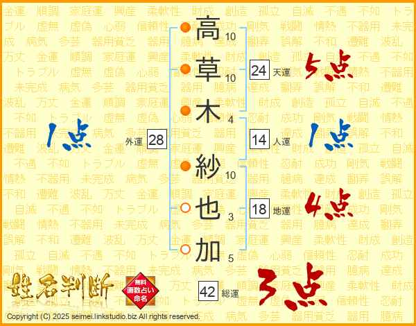 高(10画)草(10画)木(4画) 紗(10画)也(3画)加(5画)