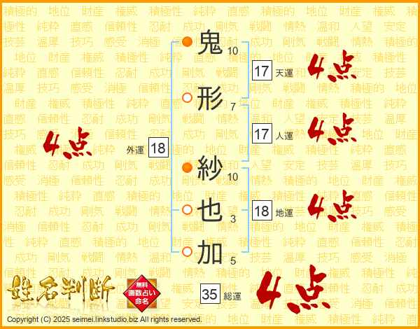 鬼(10画)形(7画) 紗(10画)也(3画)加(5画)