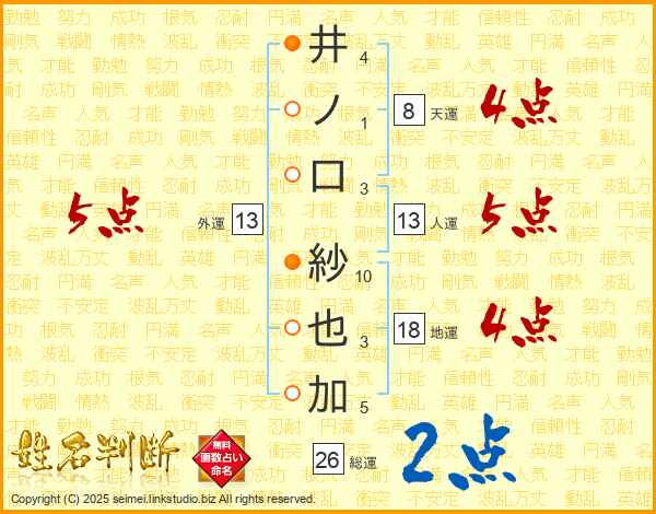 井(4画)ノ(1画)口(3画) 紗(10画)也(3画)加(5画)