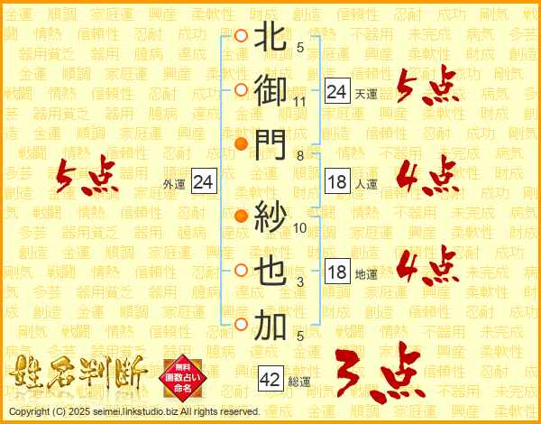 北(5画)御(11画)門(8画) 紗(10画)也(3画)加(5画)